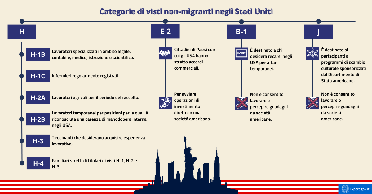 Per coloro che desiderano recarsi negli Stati Uniti per periodi prolungati ma senza l'intenzione di rimanervi permanentemente, esistono diverse categorie di visti non-migranti. Questi visti sono spesso utilizzati da persone che vogliono lavorare, fare affari o partecipare a programmi di scambio culturale negli USA. Tra le categorie più diffusi troviamo i visti H, E-2, B-1 e J.